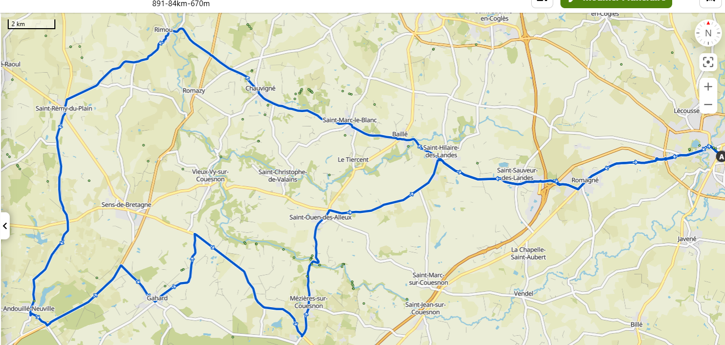 Liste des Noms :Romagné - Baillé - Chauvigné - Rimou - St Rémy - Andouillé Neuville - D23 - Gahard - Mézières - St Ouen Alleux - St Hilaire - St Sauveur - Romagné - Ste Anne-Fougères