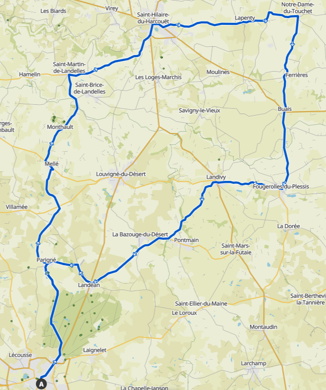 Liste des noms :Parigné - Mellé - Monthault - St Martin Landelles - St Hilaire Harcouet - Villechien - Buais - Fougerolles - Landivy - Landéan - Parigné D19 - Fougères