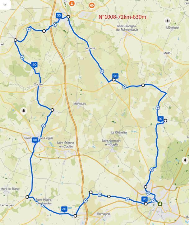 | 22/03/2026 | 1008 | 72 | 630 | Lécousse - Tricherie - Parigné - Villamé - Poilley - St James - D12 Carnet - A droite - Argouges - Coglès - La Selle - Baillé - St Sauveur - Les planches - Fougères | https://www.openrunner.com/route-details/23456198 |