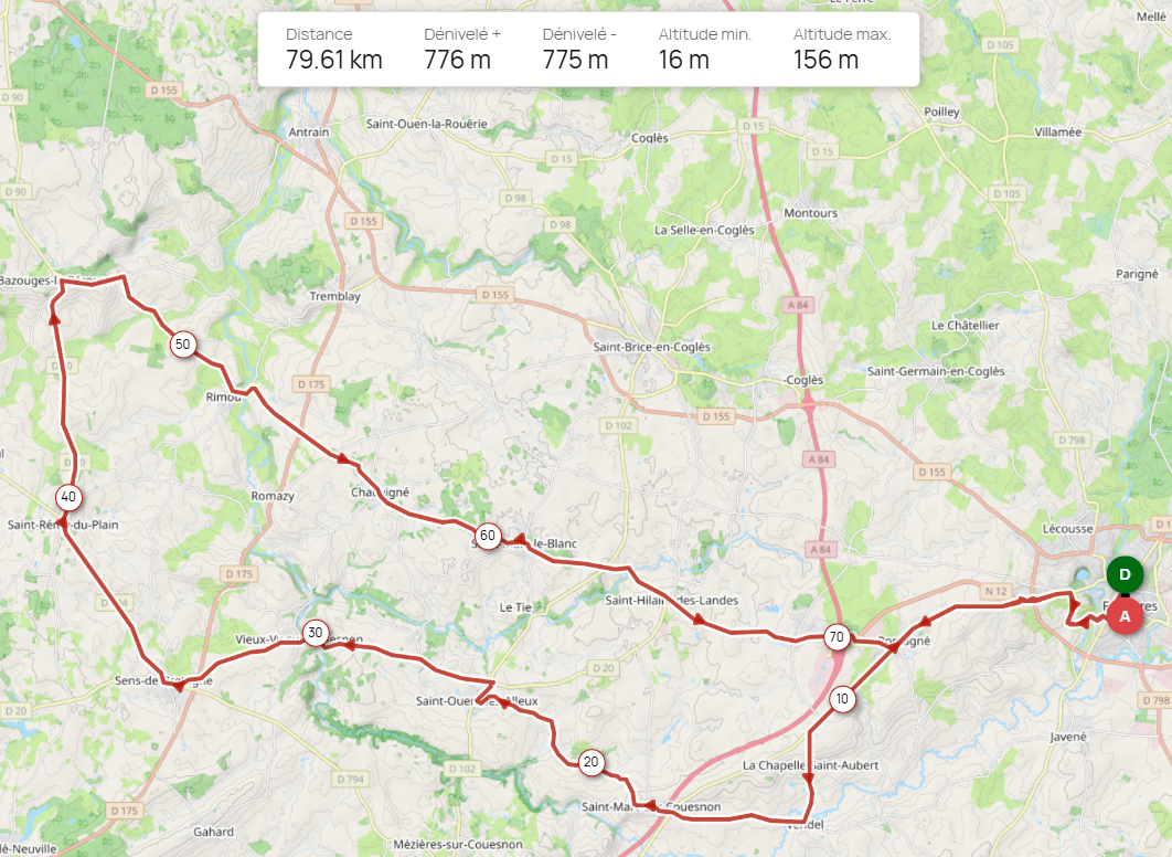 | 26/04/2026 | 730 | 79 | 776 | St Anne - Romagné - Chapelle St Aubert - Vendel - St Marc Couesnon - St Ouen Alleux - Sens - St Rémy Plain - Bazouges Pérouse - Rimou - Chauvigné - St Marc le Blanc - Baillé - St Sauveur - Romagné D812 | https://www.openrunner.com/route-details/23628407 |