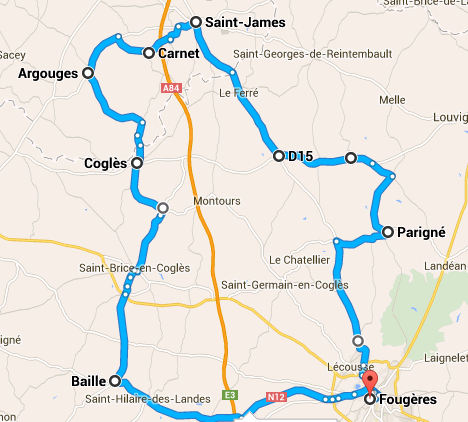 Lécousse - Tricherie - Parigné - Villamé - Poilley - St James - D12 Carnet - A droite - Argouges - Coglès - La Selle - Baillé - St Sauveur - Les planches - Fougères