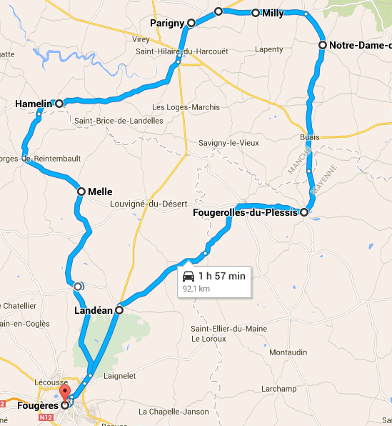 Landéan - Landivy - Fougerolles - Buais - N Dame Touchet - La croix de Pierre - Milly - Le Pointon - Parigny - St Hilaire Harcouet - Hamelin - St Georges Rtbt - Mellé - Parigné - Fougères