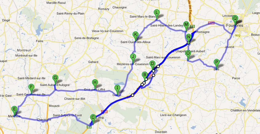 St Aubin - Liffré - La reposee - St Sulpice Foret - Chevaigne - Melesse - St Germain s Ille - St Medard - St Aubin Aubigné - Ercé - Gosné - Mezières - St Ouen - Baillé - St Sauveur - La sallorge - Vendel - Billé - Fougères