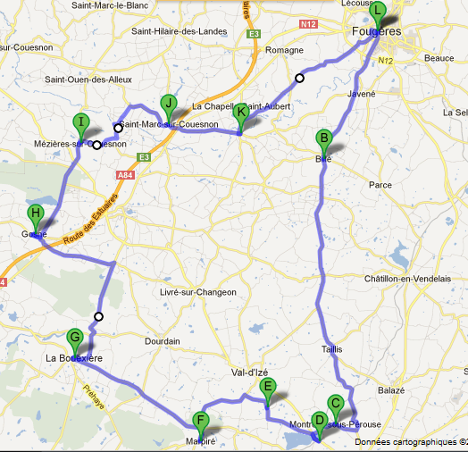 Billé - Taillis - Monteuil Pérouse - Gérard - Landavran D305 - Marpiré - La Bouexière - Le Patis - Gosné - Mézières - St Marc Couesnon - Vendel - Moulin pauvres - Fougères