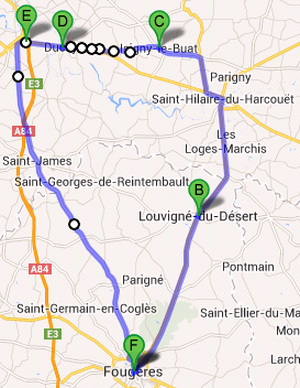 Louvigné - St Hilaire - Rte Ducey N176 - Rte Brecey D999 - Petit Jésus - Isigny le Buat - Ducey - Pontaubault - Fougères