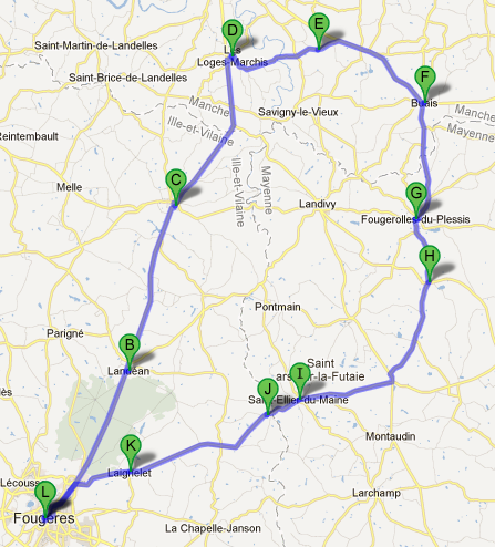 Landéan - Louvigné - Les loges - Moulines - Buais - Fougerolles - La dorée - La Tannière - St Ellier - Le Loroux - Laignelet - Fougères