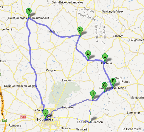 Laignelet - Mt Romain - Le Loroux - St Ellier - Pontmain - La Bazouge - Rte Landéan - Louvigné - St Georges Rtbt - La bataillère - Rte St James - Lécousse - Fougères