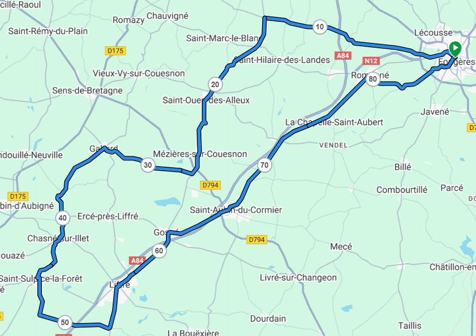 N°916-87km-720m : Croix des 5 Chemins - Baillé - St Ouen Alleux - Mézière - Gahard - Ercé - Chasné - St Sulpice - Mi-foret - La Villeneuve - Liffré - Gosné - St Aubin - Romagné-La tancerai-Moulin aux pauvres